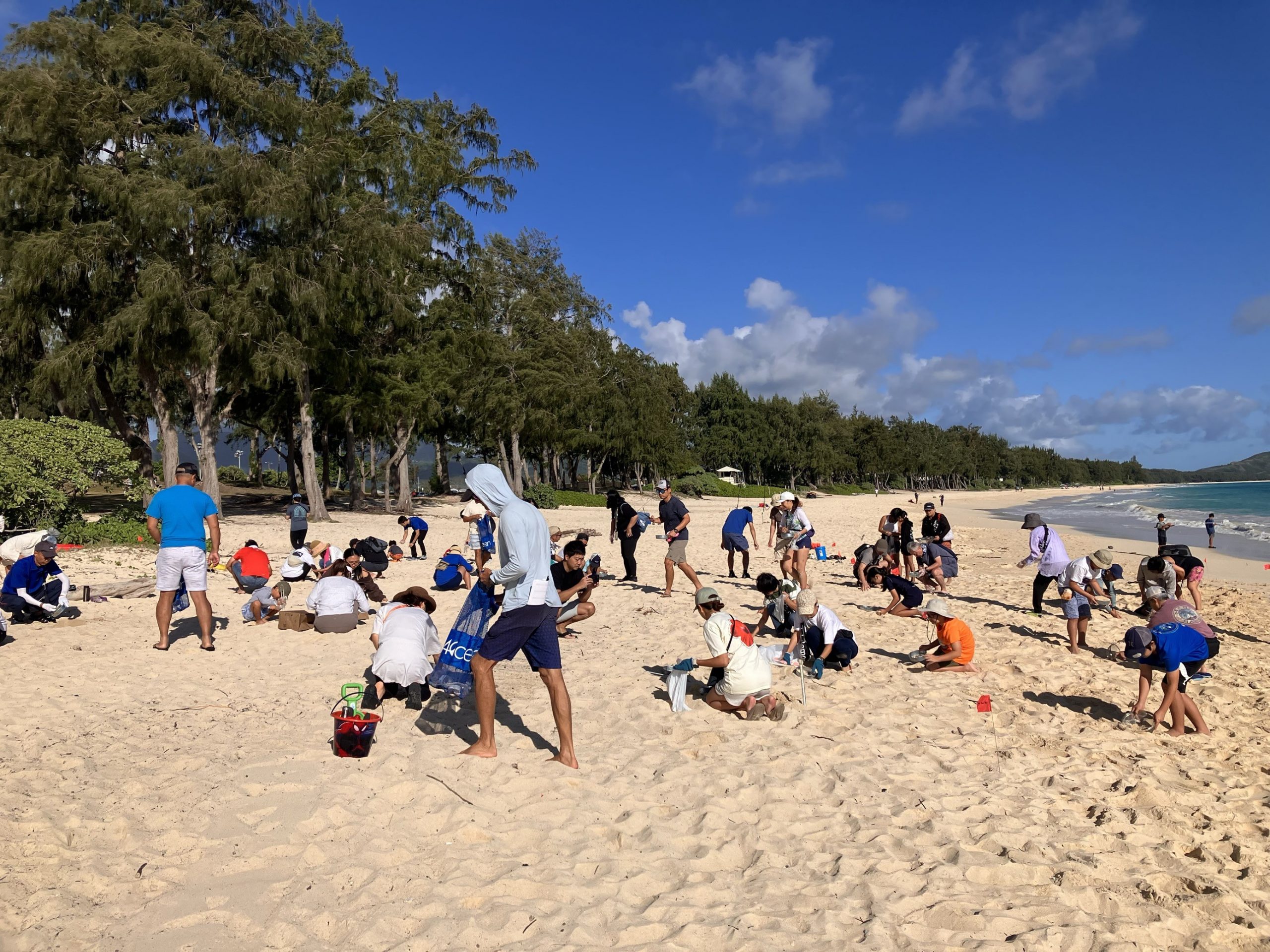 活動レポート ハワイ当日はオアフ島の東部に位置し、透明度が高く鮮やかな青色の海・美しい白い砂浜がどこまでも広がる「ワイマナロビーチ」でクリーンアップイベントを実施しました。地元の有志を中心にITO EN(HAWAII)LLCの社員を含めた82名が参加。参加者は砂浜に点在するプラスチックなどのゴミの除去などを行いました。