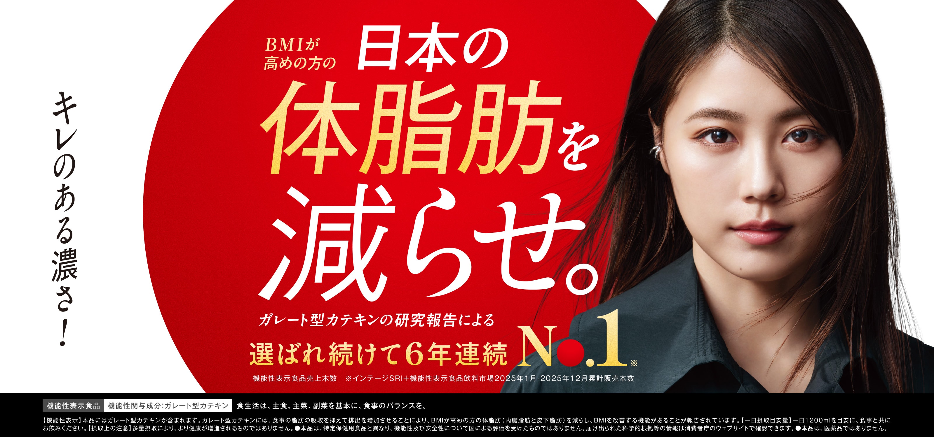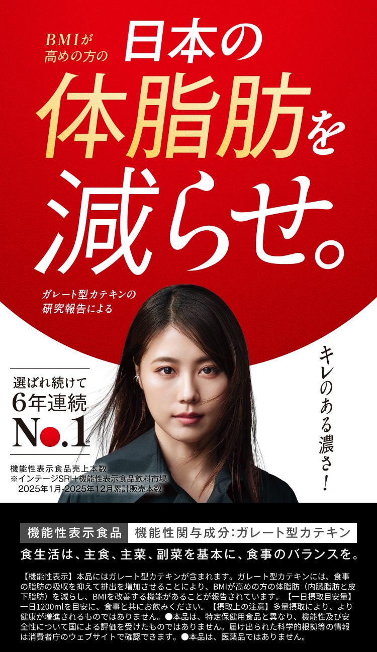 - 届出表示:本品にはガレート型カテキンが含まれます。ガレート型カテキンには、食事の脂肪の吸収を抑えて排出を増加させることにより、BMIが高めの方の体脂肪(内臓脂肪と皮下脂肪)を減らし、BMIを改善する機能があることが報告されています。